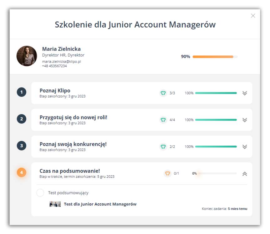 Na profilu znajdziesz wszystkie najważniejsze informacje na temat pracownika, także dedykowaną zakładkę z przypisanymi kursami. Szybki dostęp umożliwia przejście bezpośrednio z profilu do szkolenia.