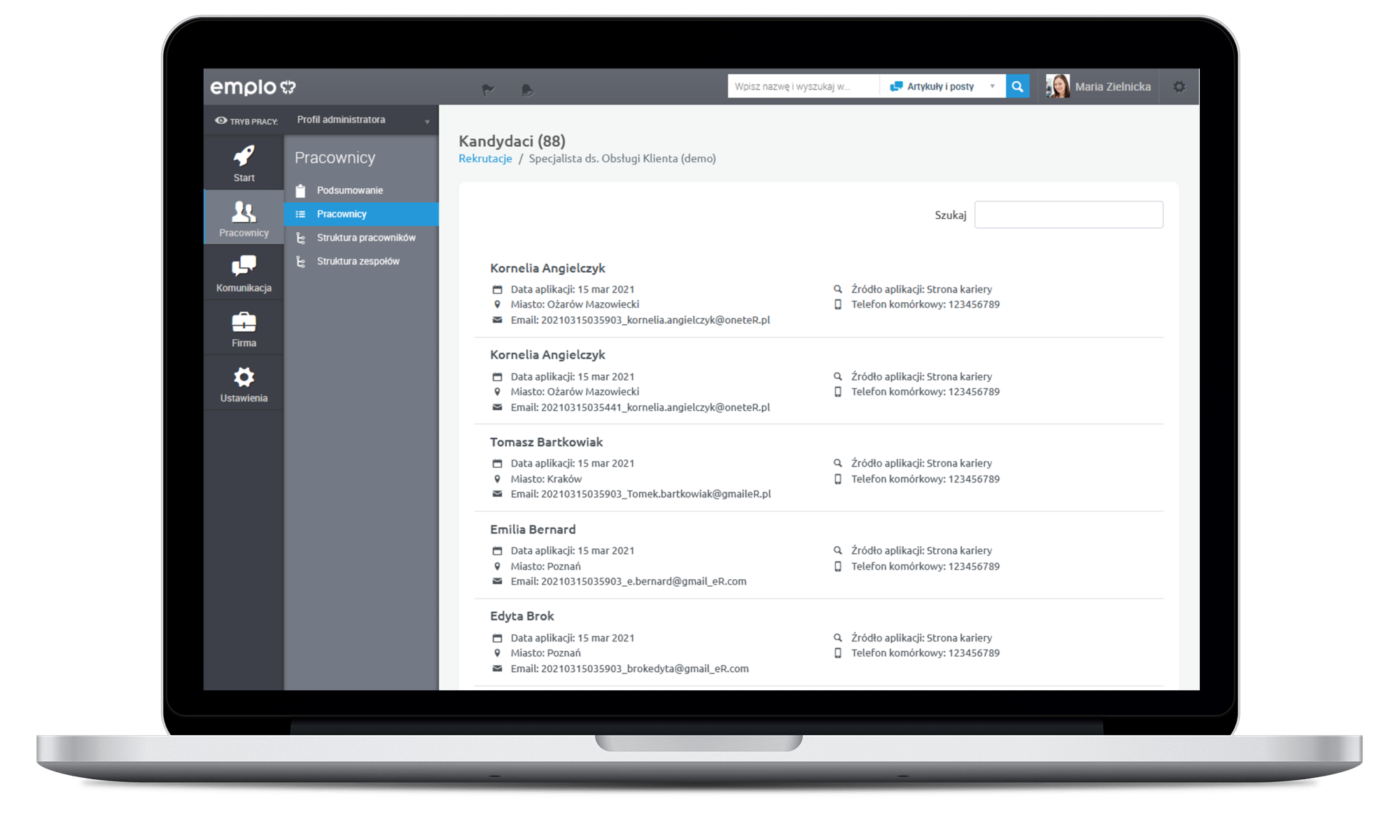 Administratorzy emplo, posiadający uprawnienia do dedykowanego profilu, mają dostęp do bazy prowadzonych przez firmę rekrutacji. Po podjęciu decyzji o zatrudnieniu wystarczy wybrać odpowiedni proces oraz odnaleźć kandydata na liście.