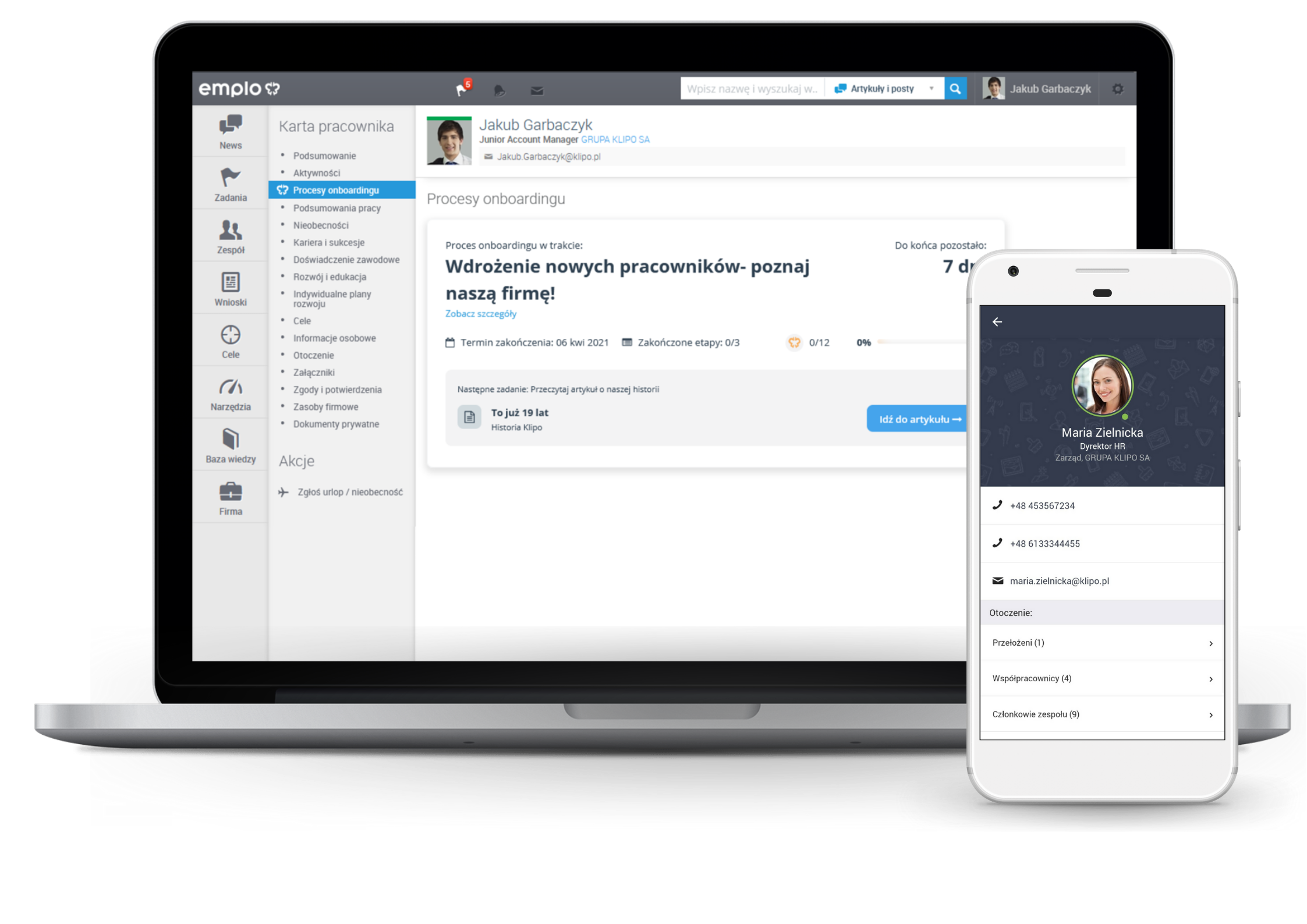 Przygotuj się na nową osobę w zespole. Stwórz profil i zadbaj o wdrożenie jeszcze przed pierwszym dniem w pracy. Opracuj oraz przypisz do pracownika dedykowane zadania, które będzie musiał wykonać po dołączeniu. Dopisz go do grup firmowych, procesu onboardingu czy ankiety oceny procesu rekrutacji (Candidate Experience).