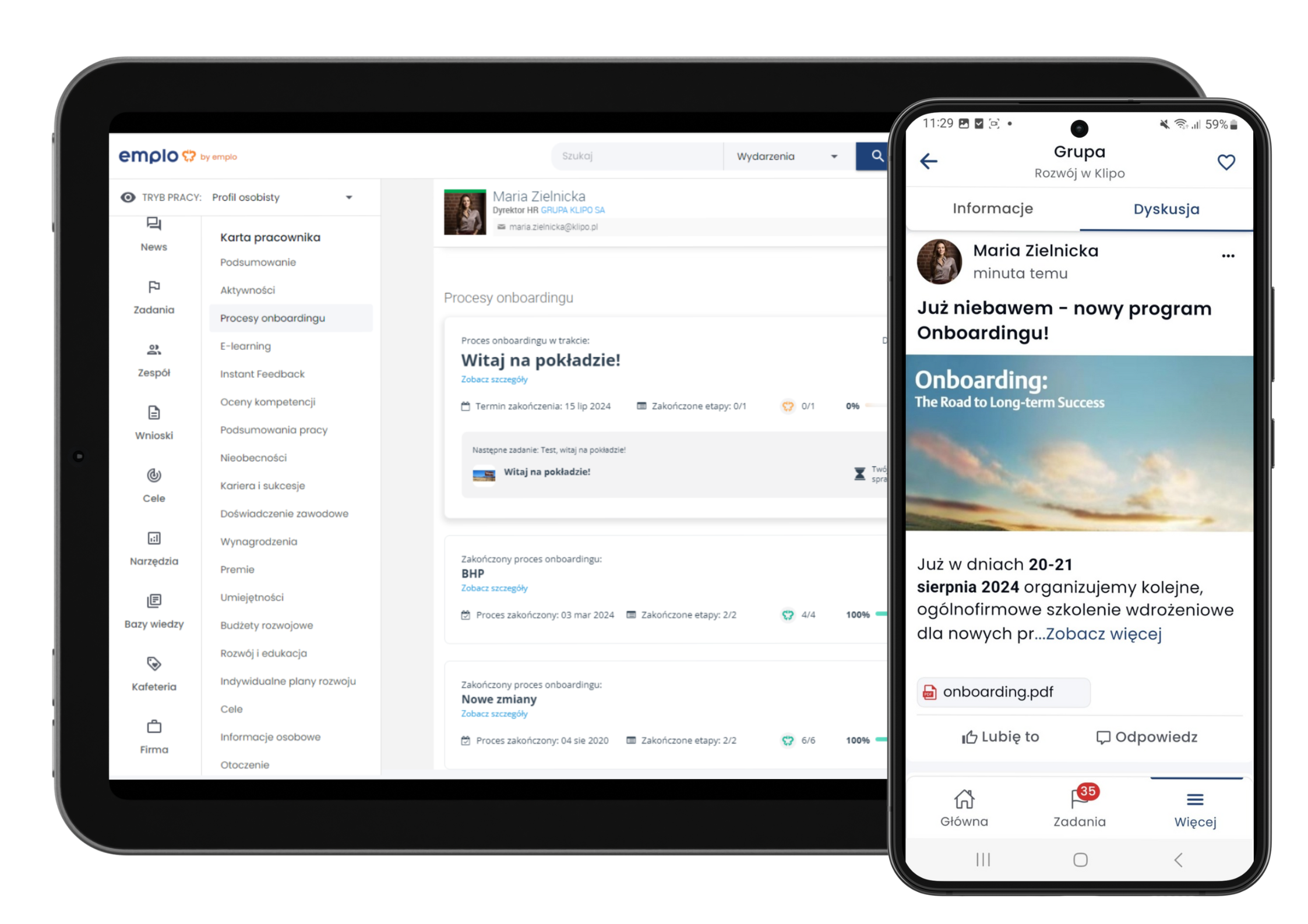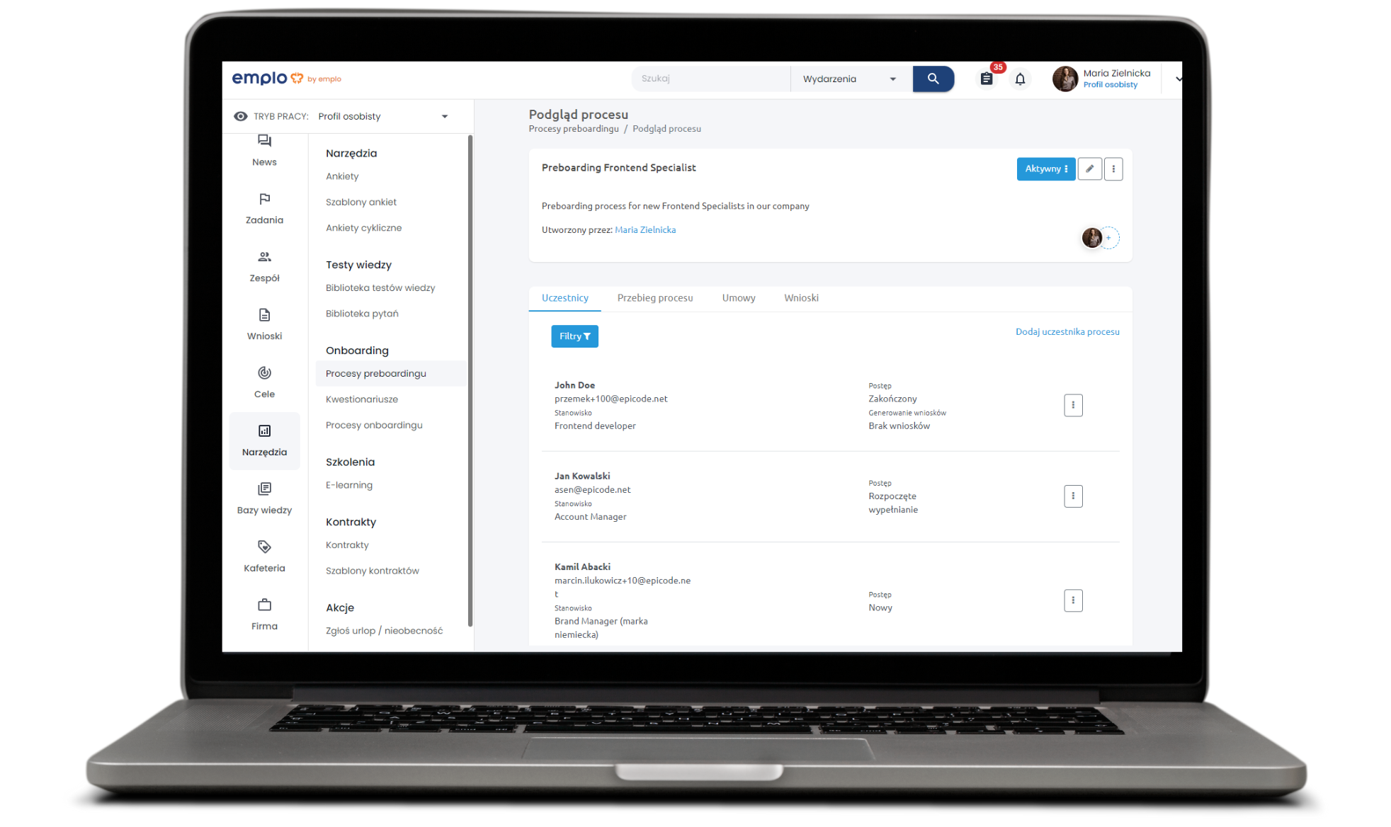 Preboarding przeprowadzony? Czas na dalsze kroki! System emplo oferuje Ci dostęp do pełnego modułu onboardingu, który pokieruje dalszą ścieżką nowego pracownika w firmie. Do dyspozycji masz: