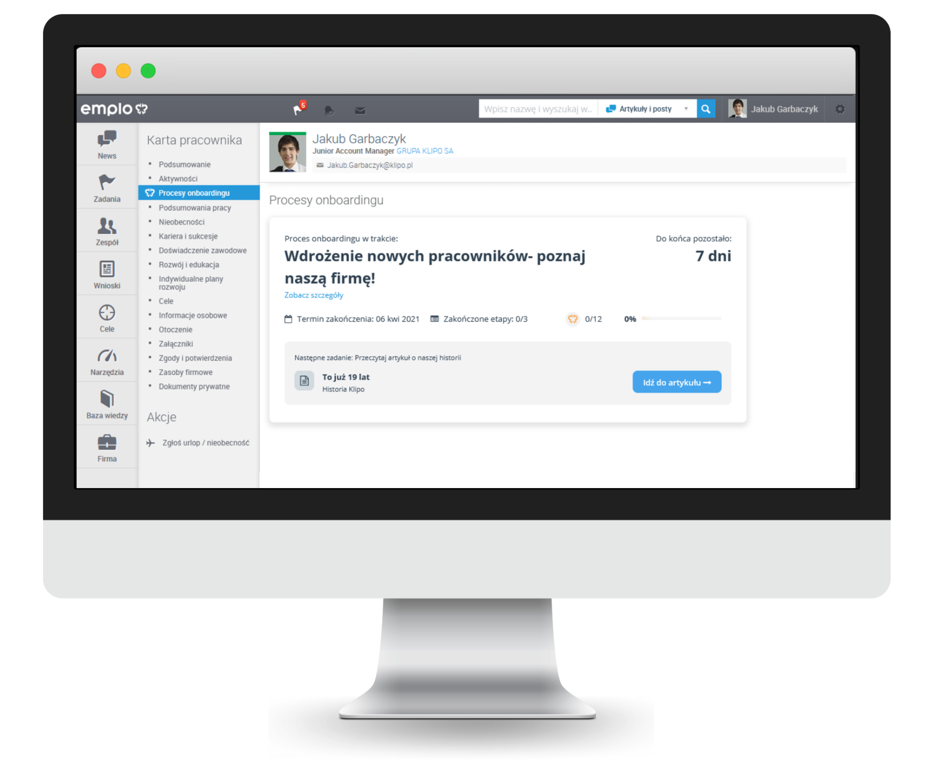 Jesteś w trakcie procesu onboardingu? emplo przypomni Ci o kolejnych etapach, które masz przed sobą! Najważniejsze informacje są stale wyświetlane w “Aktualnościach”.