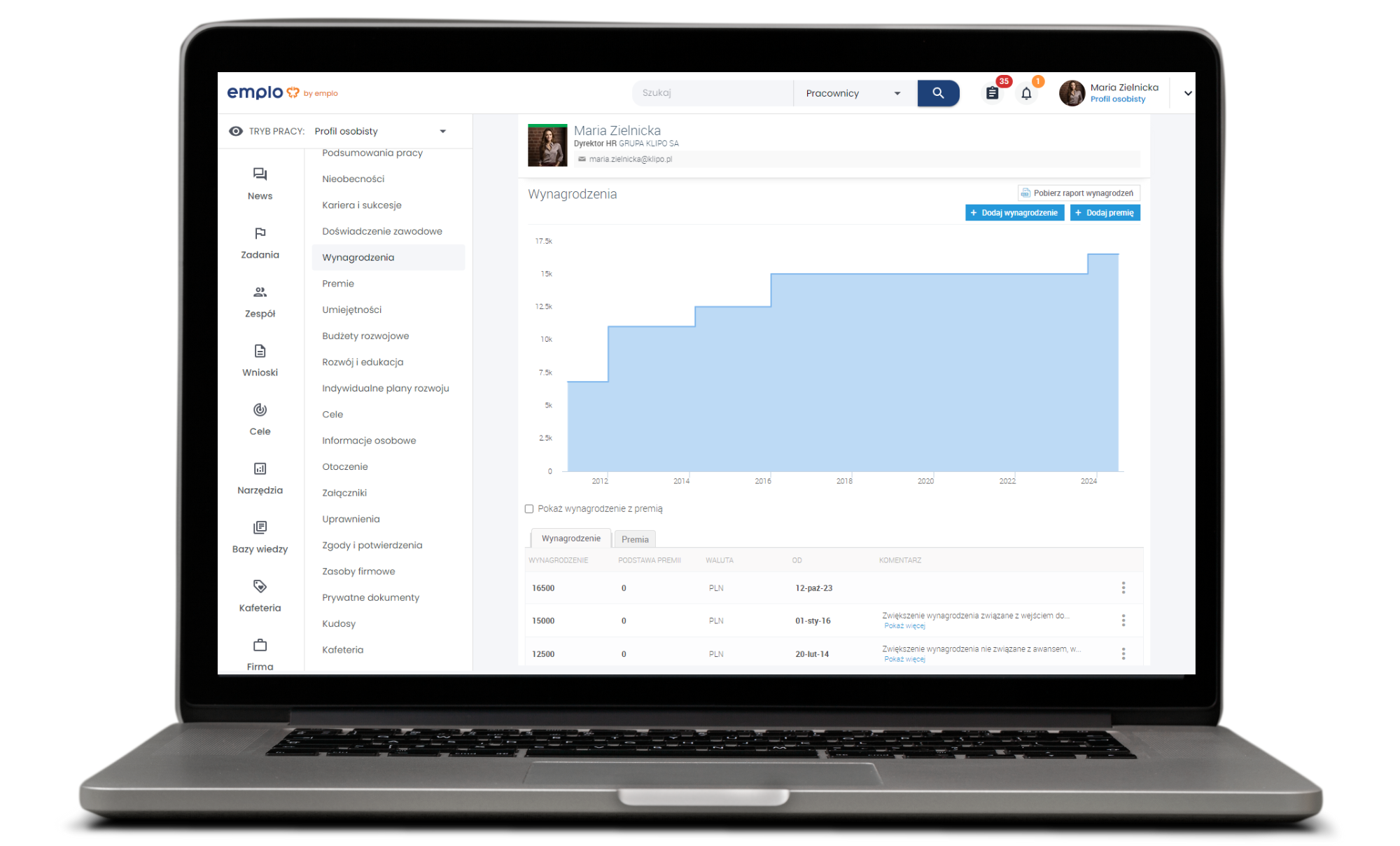 Z modułem wynagrodzeń administratorzy mają wgląd do raportu wynagrodzeń dotyczących wszystkich pracowników. Znajdziesz w nim dane: imię i nazwisko, zespół, spółkę, zajmowane stanowisko, datę ostatniego awansu, a także wysokość aktualnej pensji. Dodatkowo możesz sprawdzić dedykowany, oddzielny arkusz z historią wynagrodzeń w firmie.